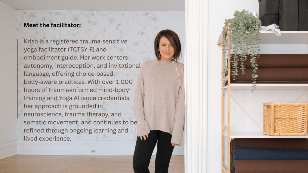 If you’re seeking to learn or deepen your understanding of trauma-informed approaches, you’re invited to join one or both of my Yoga Alliance Continuing Education (YACEP) programs. Each offering is grounded in the principles of safety, choice, and empowerment, creating a supportive learning environment that honours your pace and lived experience.